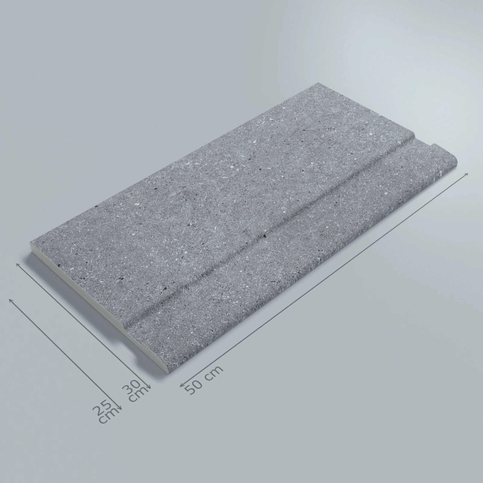 Available in 25×50 cm and 30×50 cm dimensions, the Cement Grey Classic porcelain pool coping adapts easily to different pool designs. Its resistance to UV exposure, temperature variations, and pool chemicals ensures long-lasting performance, while its high resistance to wear and impact makes it suitable for both private and high-traffic pool projects.