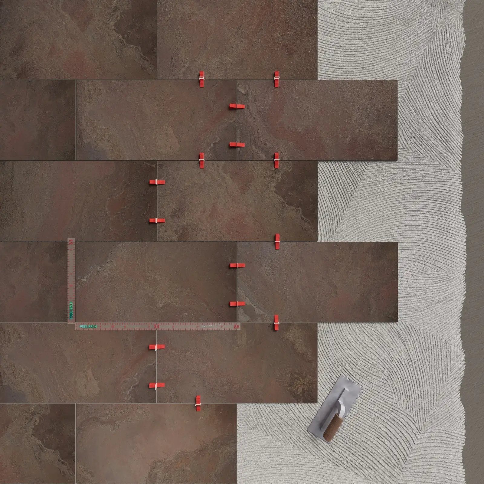 Red Dune is a 33×66 cm porcelain tile inspired by the striking character of red-toned natural slate. Its warm color transitions and textured stone appearance create a bold visual impact in outdoor spaces, making it a durable and stylish choice for pool terraces and verandas.