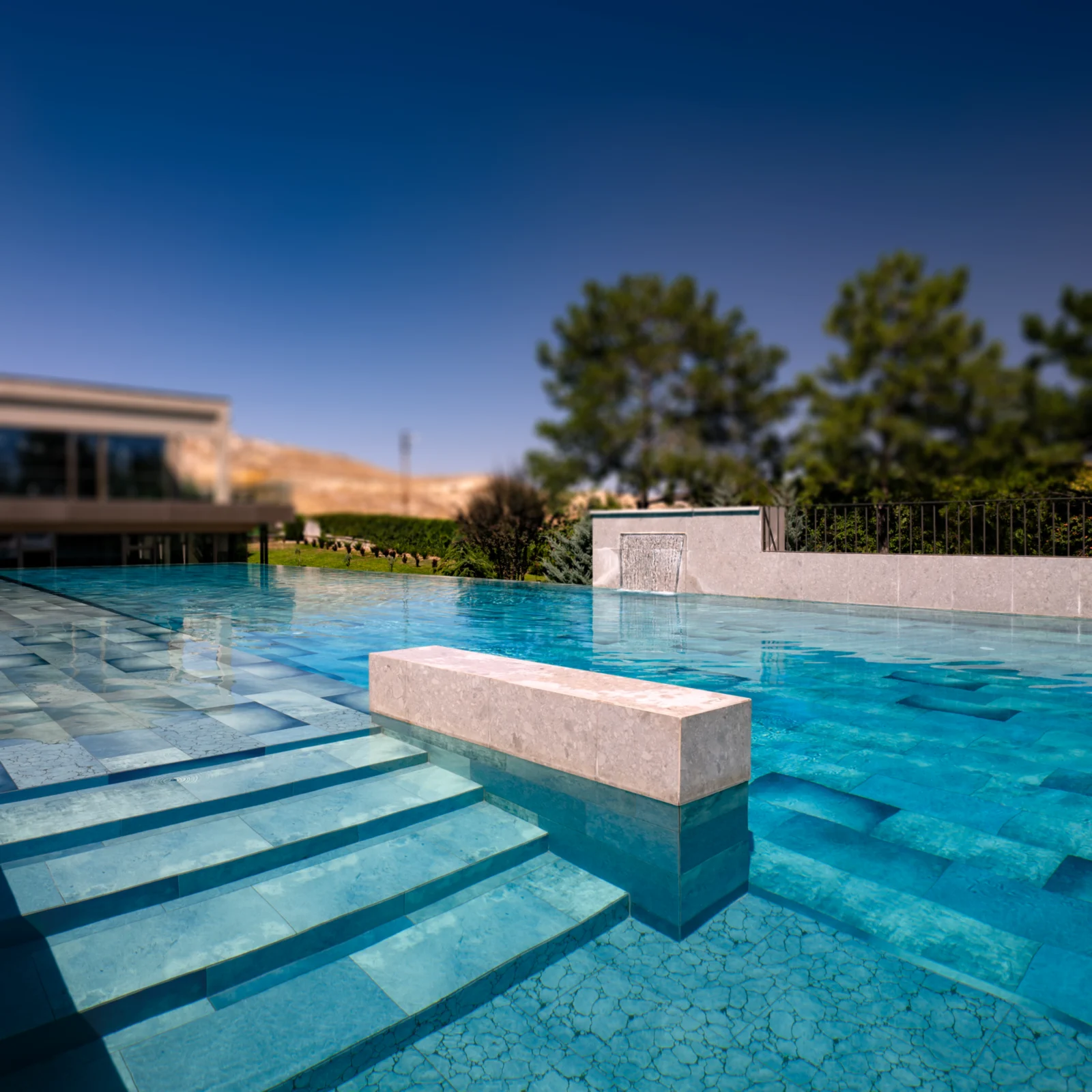 Beyaz mermer küpeşteler veya gri doğal taş basamaklarla kombinlendiğinde, Blue Bead’in mavisi daha da çarpıcı hale gelir. Işığın su altındaki oyunlarını en canlı şekilde yansıtan bu seri, havuzu mekanın en prestijli ve davetkar noktası haline getirmek için tasarlanmıştır.