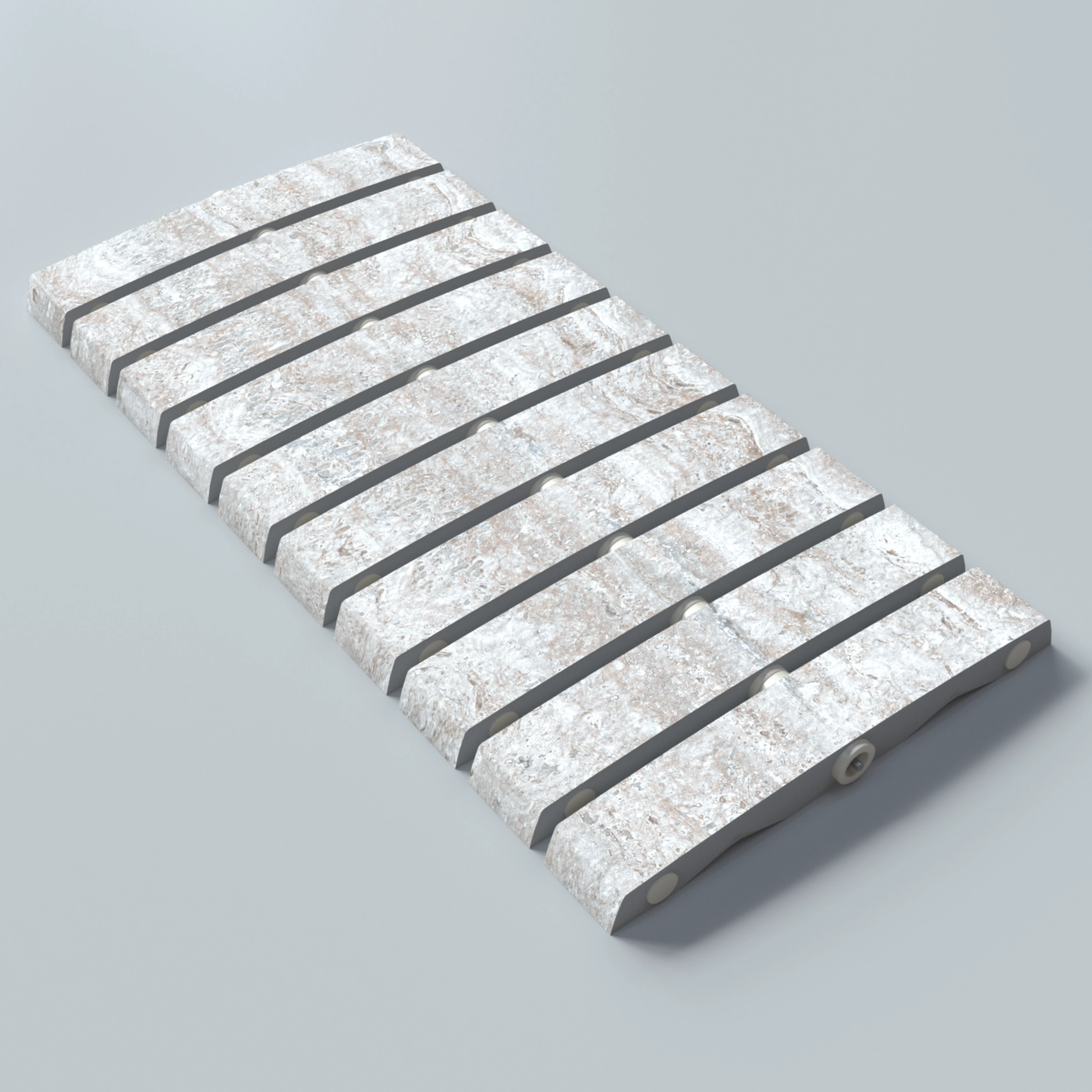 Silver Traverten Porselen Flex Izgara, portatif ve esnek yapısı sayesinde farklı formdaki havuzlara zahmetsizce uyum sağlayan özel bir drenaj çözümüdür. Özellikle dairesel ve kavisli hatlara sahip havuz projelerinde, uygulama kolaylığı ve estetik bütünlüğü bir arada sunar. Doğal taş görünümlü porselen yüzeyi, havuz çevresine sade ve zamansız bir şıklık kazandırır.